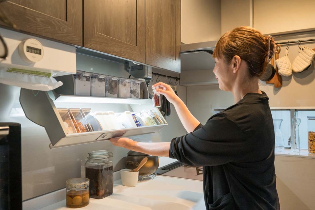 「高さが変えられるので乾物類やせいろ・お猪口などそれぞれ入れる物のサイズに合わせられるんです。ピタッと収まるのが嬉しい」