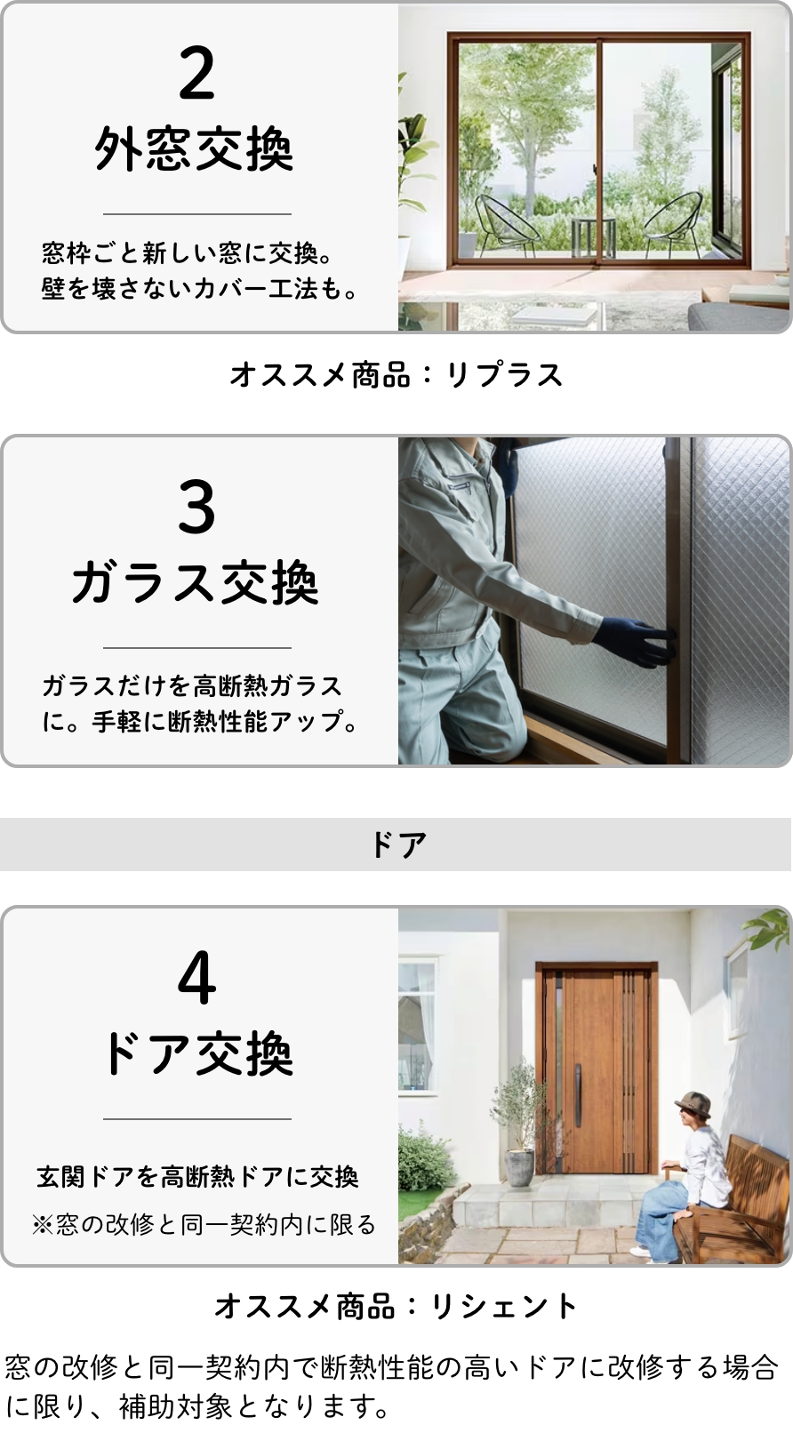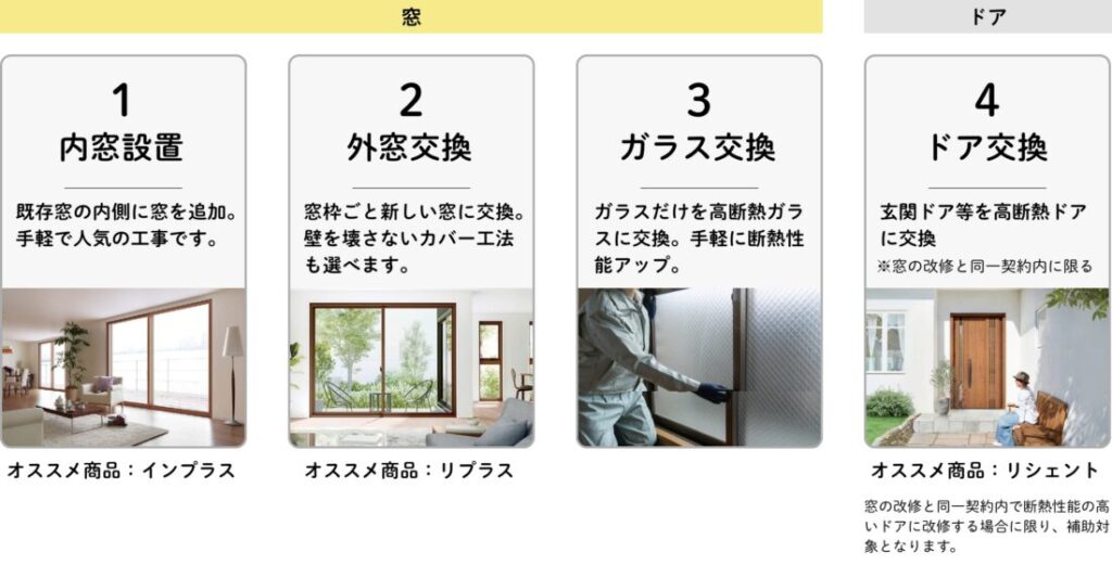 実施する窓・ドアのリフォーム工事の内容に応じて定額で補助