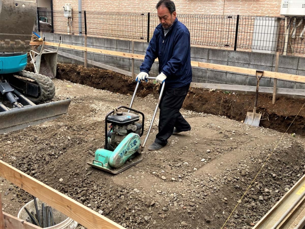 土はやわらかいので、そのまま上にコンクリートを流すと、コンクリートが沈んだり傾いたりしてしまいます。そうならないよう、石を敷き詰めて、専用の圧縮する機械などを使って踏み固めます。そうする事で、しっかりと安定した地盤が作られるんですね。