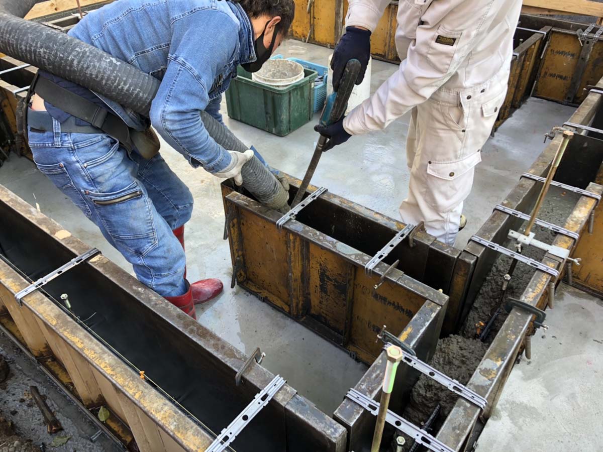 コンクリート打設は時間との勝負でもあるんです!コンクリートが固まってくる前に作業を終わらせなければいけません。