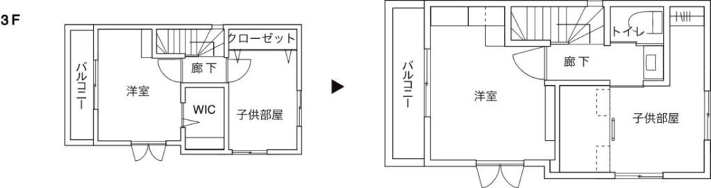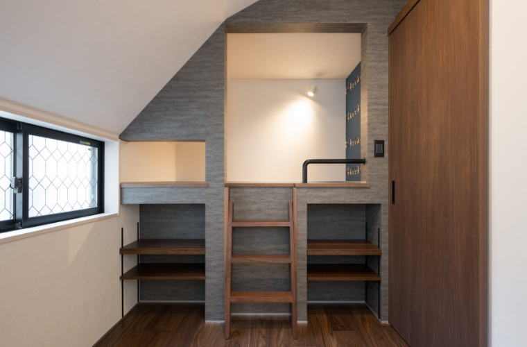 3階の主寝室と子ども部屋では、境目となる空間を上下で分けて活用し、限られた面積を最大限に生かしています。子ども部屋は施工前よりも面積が小さくなったにもかかわらず、窮屈さを感じさせないレイアウトを実現しました。