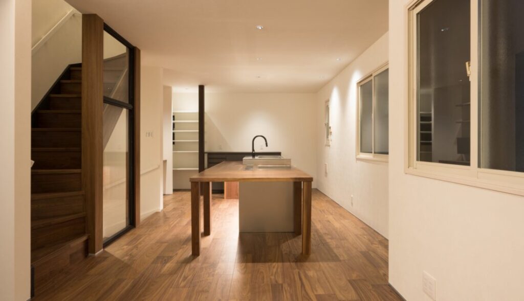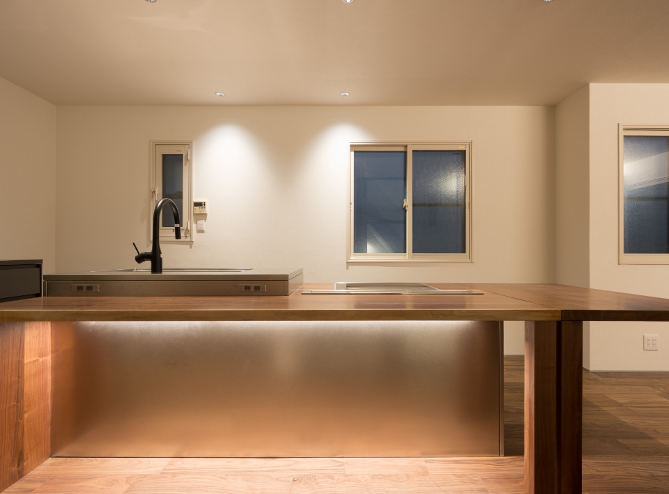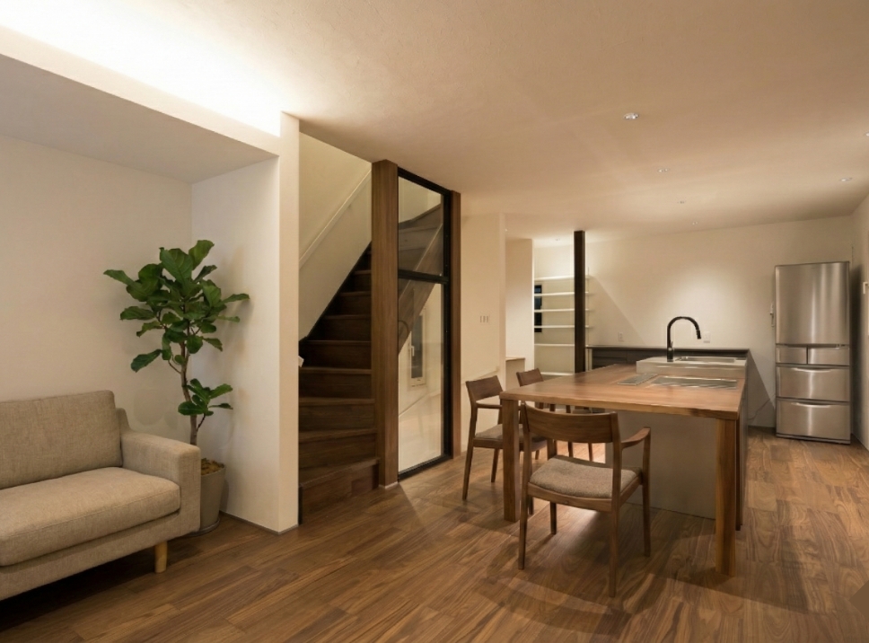 「狭小住宅だから」と可能性を狭めるのではなく、ガラス素材や丁寧な照明計画を取り入れることで、実際の面積以上の広がりを感じられる空間に仕上げました。2階の中心に据えたオーダーメイドキッチンは、一見すると圧迫感が出そうな大胆なプランですが、回遊できる動線を確保したことで、どこにいても家族の気配を感じられる、心地よい一体感が生まれています。