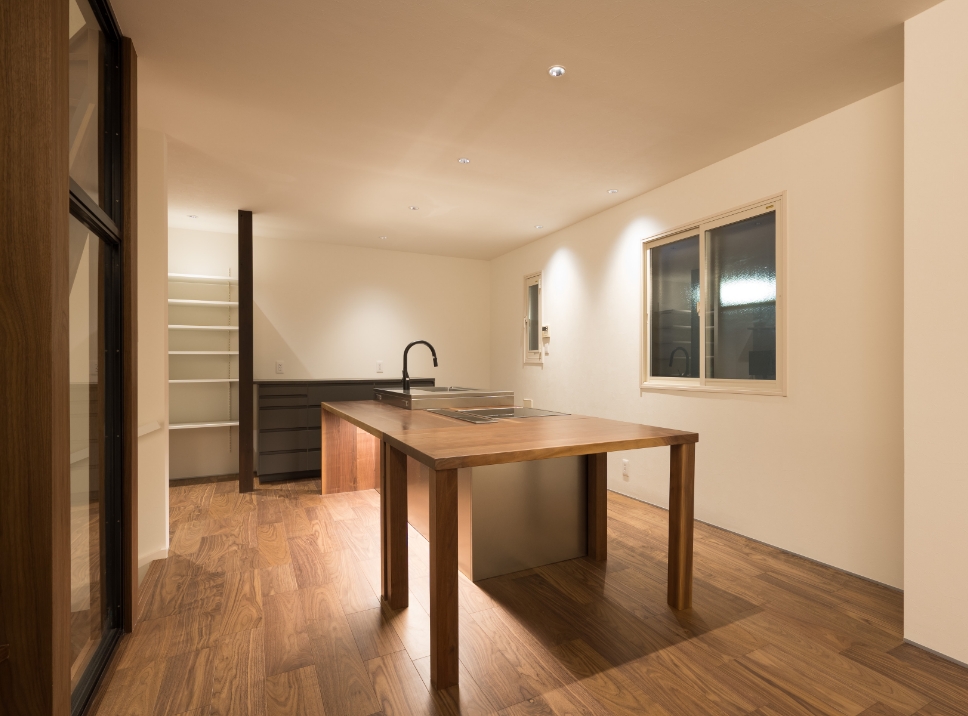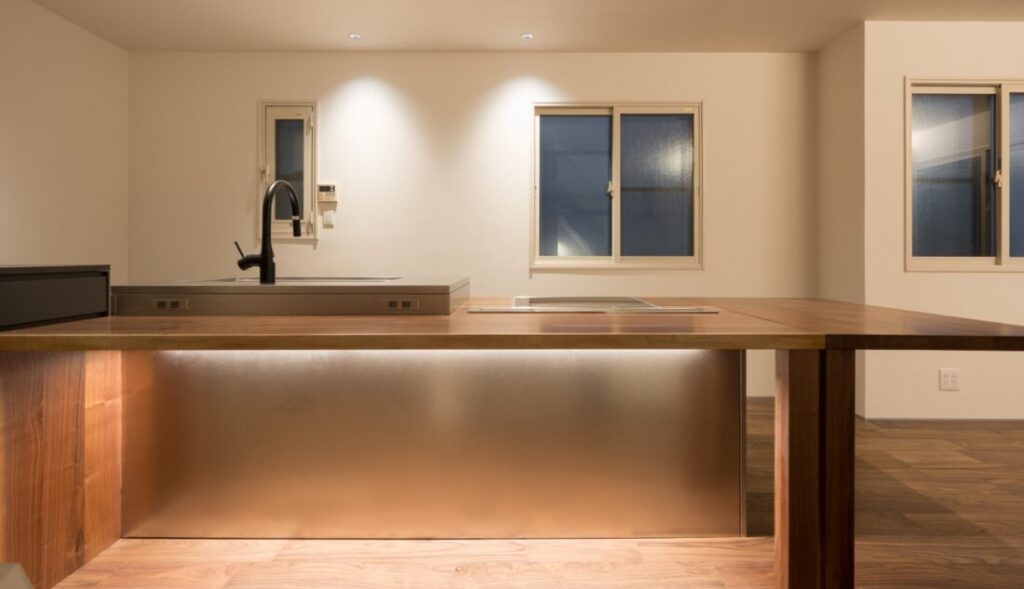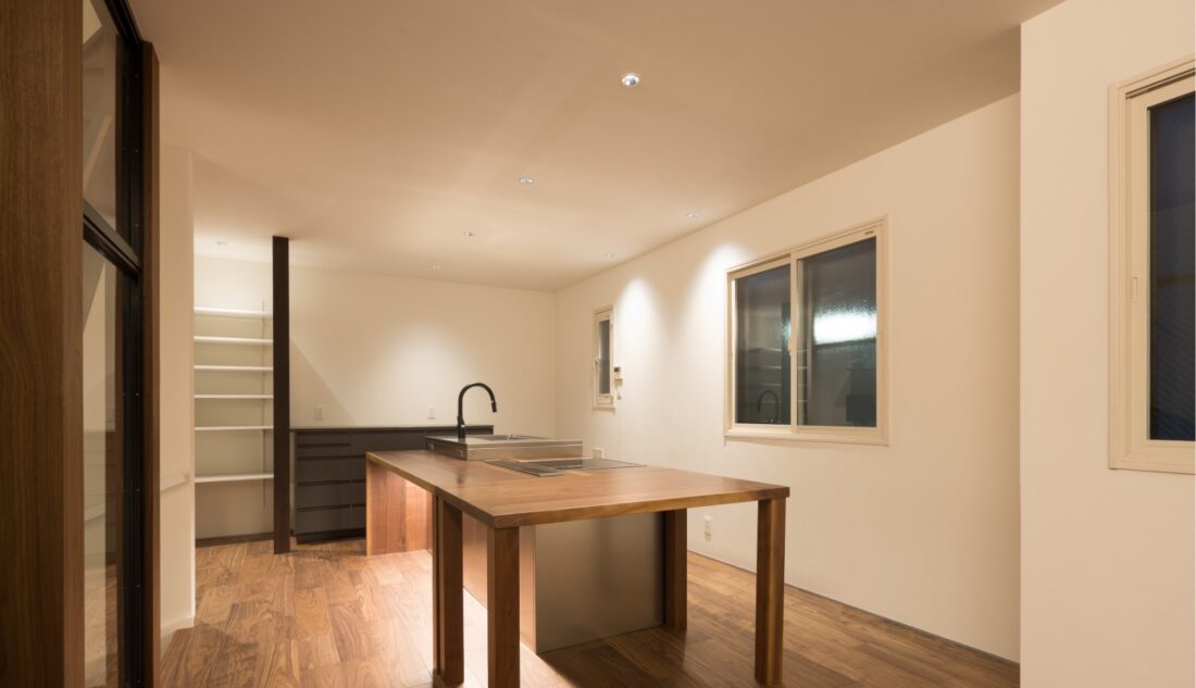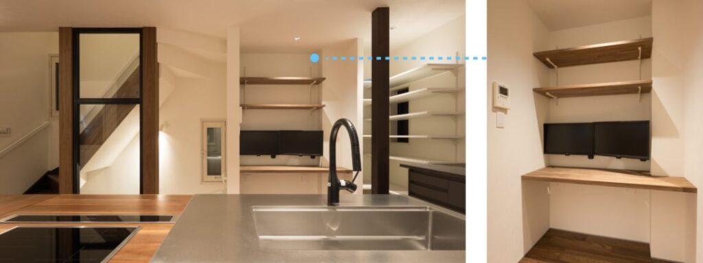 キッチン横のワークスペース。家事と作業をスムーズに行き来でき、家族とのつながりも感じられる配置です。