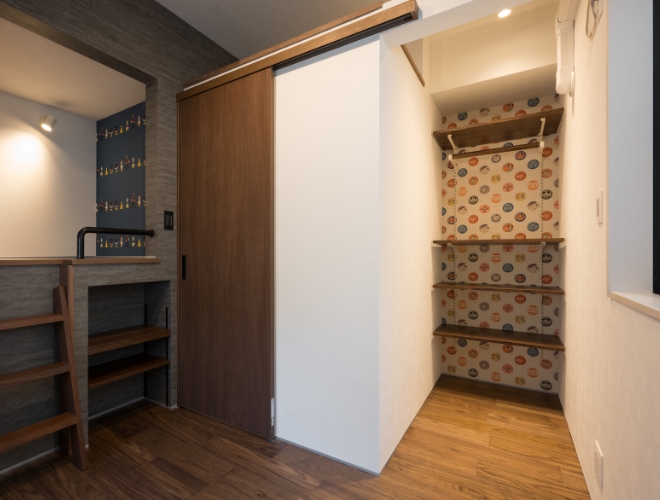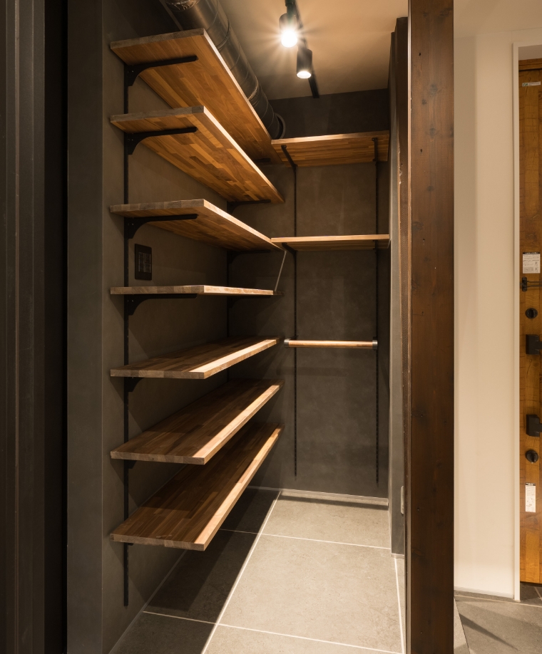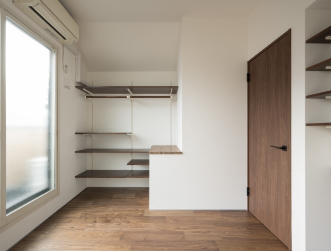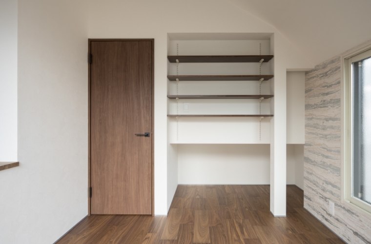 扉を設けずオープンに仕上げた収納スペースは、奥行きを感じることで空間の閉塞感をやわらげ、室内全体が広く感じられる効果があります。