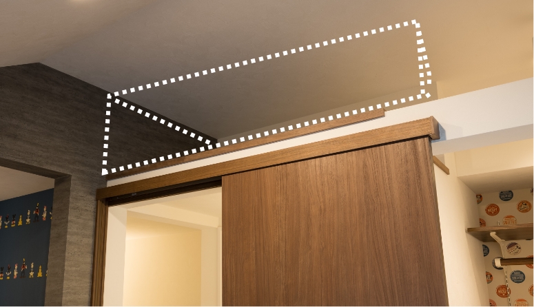 子ども部屋の扉上部には、廊下の天井裏を活用したロフト収納を設けました。成長とともに荷物が増えても対応できるよう、空間を有効に使いながら十分な収納量を確保しています。